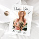 Um simples e moderno obrigado de graduação que você faz para enviar para aqueles que o felicitaram, frequentaram sua festa de formatura, lhe deram presentes etc. Ele diz "obrigado você" no topo de uma fonte casual escrita escrita à mão com um coração no final. Você pode adicionar uma segunda imagem no verso e a mensagem é editável.
