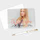 Na moda e cartões de agradecimentos de graduação dobrado elegante apresentam uma foto de mais velho com a cobertura de script de folha de rosa ouro falso "obrigado you". Personalize o texto personalizado moderno com seu nome de formando, escola e ano de aula. Um obrigado personalizado que você envia e/ou fotografar pode ser adicionado ao dentro da placa.