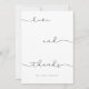 Envie seu amor e obrigados para sua família e amigos com nosso mínimo e moderno roteiro de escrita de amor e obrigados de casamento. O design apresenta um design tipográfico mínimo de na moda com "Amor e Obrigados" exibido em um moderno script de letras de mão pretas e personalizado com nome. o verso apresenta um layout de foto de cheio para mostrar sua foto especial de casamento do dia especial com o design de tipografia "amor" e o obrigado personalizado que você exibiu na foto.