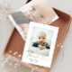 Elegante Dourado Script Baby Photo Cartões de agradecimentos. O verso inclui uma mensagem da família e uma foto de segundo. Clique no botão editar para personalizar este design com suas fotos e detalhes.