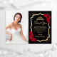Cartões de agradecimentos de celebração do ouro vermelho preto Quinceanera. Apresenta fontes de script, rosa vermelha, tiara e ouro brilhante. Design clássico com sua foto. Perfeito para uma elegante celebração de glam estilo princesa.