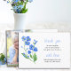 Cartões de agradecimentos funerário com foto memorial e obrigado personalizado da sua mensagem. O design apresenta um roteiro casual manuscrito e arranjos de aquarela de flores azuis que me esquecem e não. O modelo está preparado para você adicionar uma foto 'em memória amorosa' às costas com o nome de seu ente querido, assim como sua mensagem personalizada de obrigados na frente.