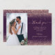 Personalize este elegante obrigado de casamento... com sua foto de casamento vertical à esquerda. As palavras "obrigado você" aparecem à esquerda em um guião de letra rosa-rosa com flores no começo e no fim. Adicione uma mensagem de sua escolha em itálico em um plano de fundo roxo com bordas de brilho rosa douradas. Adicione seus primeiros nomes e a data do casamento no reverso sobre uma varanda roxa.