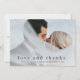 Uma simples foto de casamento de fotos, obrigado bilhete de nota com amor editável e obrigados saudando na frente. As costas têm uma mensagem pessoal do casal. Clique no botão editar para personalizar este design com suas fotos e detalhes.