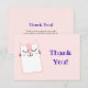 Um cartões de agradecimentos com uma ilustração de um gatinho adormecido. Olhos fechados com aparência feliz e pacífica. Colocado sobre um fundo rosa pálido. A mensagem no verso pode ser personalizada como quiser. A parte de trás do cartão também ilustra um gato ondulando em preto e branco.