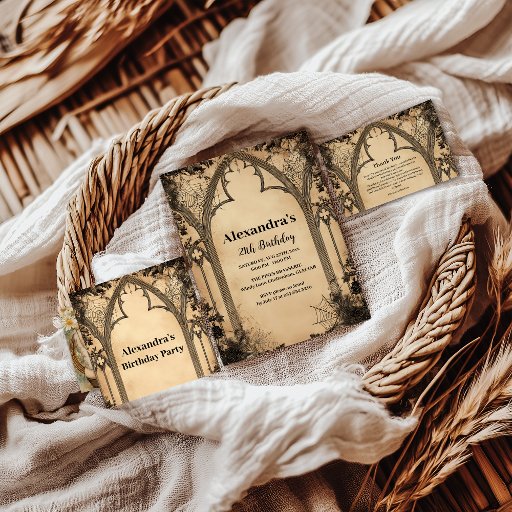 A dramatic gothic birthday design featuring an ornate black arch draped in dripping vines, antique candelabras, dark roses, and an aged parchment center for your event details. Rich shadows, subtle grunge textures, and romantic candlelight set an atmospheric, mysterious tone. Perfect for anyone who loves dark elegance, moody aesthetics, and vintage gothic style. Fully customizable text allows you to tailor it to any milestone or themed celebration with ease.