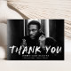 Na moda, cartões de agradecimentos de graduação moderno com a foto horizontal do formando com "Obrigado" em letras brancas com placas de pintura brancas. Personalize a frente do cartões de agradecimentos criativo adicionando o nome do formando, o nome da escola e o ano de graduação. A parte traseira do cartões de agradecimentos de fotos de graduação apresenta espaço para um obrigado digitado ou manuscrito que você envia e um plano de fundo preto e branco para pintura.