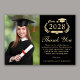 Cartões de agradecimentos de graduação em preto moderno, com "Classe de" em uma ilustração clara e dourada da coroa de louros com um boné de formando e diploma, uma foto do formando, "Obrigado" em uma elegante escrita de ouro, e um obrigado personalizado que você envia e o nome do formando em tipografia de ouro.