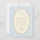 Thank your birthday guests with this enchanting Harry Potter Hedwig thank you design. Featuring Hedwig flying gracefully with a letter in her beak, the artwork is framed inside an elegant scalloped oval accented with warm golden details and delicate scattered stars for a magical Wizarding World feel. Classic blue and white vertical stripes create a timeless backdrop, giving this design a sweet and refined look perfect for boys of any age.