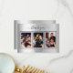 Adicione 3 das suas fotos de aniversário, tamanho vertical, uma data, nome e a nota de agradecimento. Um fundo com aparência de prata falsa com texto e quadro preto. O texto: Obrigado na parte frontal e seu nome no verso é escrito com um roteiro à mão com na moda com baloiços.