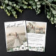 Cartões de agradecimentos de casamento floral com sua linda foto de casamento impressa na frente com obrigado em um roteiro bonito, e um arranjo ilustrado de anêmonos brancos, eucalipto, e verde adorando o canto inferior direito do cartões de agradecimentos de casamento plano. Do outro lado, adicione mais duas fotos da sua foto de casamento, sua obrigado personalizada que você envia, e seus nomes acima de flores brancas mais bonito com verde em tons suaves de verde junto com uma paleta mais profunda de verde-mossy e laranja queimado.