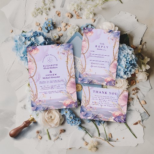 This elegant coastal wedding design blends soft lavender tones with watercolor seashells, drifting sea grasses, and hand-drawn nautical ropes framing the details. The artwork feels airy and ocean-kissed, perfect for couples celebrating by the sea or dreaming of a romantic shoreline atmosphere. Every element is illustrated with a gentle, pastel touch, giving the invitation a refined yet whimsical coastal charm. A beautiful choice for beach weddings, destination ceremonies, or any event inspired by tides, texture, and timeless romance.