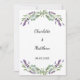 A white background, decorated with lavender, violet flowers and eucalyptus greenery.