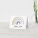 Cartões modernos de agradecimento com arco-íris, apresentando um arco-íris em aquarela na frente em tons de azul, marrom e dourado com "Obrigado" exibido abaixo em letras pretas. Personalize o cartão de agradecimento do arco-íris adicionando seu nome ou texto personalizado. O interior do cartão é em branco com muito espaço para sua mensagem de agradecimento digitada ou manuscrita. A parte de trás do cartão de agradecimento dobrado apresenta um padrão de arco-íris correspondente. O cartão de agradecimento do arco-íris em aquarela é perfeito para usar em chás de bebê, festas de aniversário e muito mais!