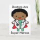 Diga obrigados ao médico na sua vida com este cartão personalizável legal! Um médico afro-americano completo com esfregões, estetoscópio e casaco de médicos feitos no estilo kawaii. Ele também veste uma capa super-herói porque os médicos salvam vidas e isso os torna super heróis! O texto preto diz, "Médicos são Super Heróis" e o texto do dentro diz, "Obrigados para tudo que você faz!", mas ambos podem ser alterados e personalizados para ajustado de suas necessidades! Excelente para o Dia Nacional dos Médicos!