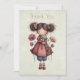 Cartão de agradecimento com uma imagem retrô fofa apresentando uma menina caprichosa com bochechas rosadas e flores no cabelo. Carregando uma boneca de sapo verde.