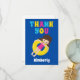 Cartão de agradecimento incrível para festa de piscina para crianças morenas no time de natação durante o verão. Apresenta uma explosão de cores brilhantes e divertidas e uma menina nadadora adorável em um tubo inflável.