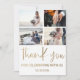 Cartões de agradecimentos minimalista moderno. Apresentando uma caligrafia elegante em folha falsa de ouro e espaços para adicionar 4 das suas fotos especiais de casamento. Fácil e divertido de personalizar para criar suas próprias placas "Obrigado" exclusivas.