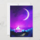 Crescente grande envolto em nuvens rosa e roxa no céu azul-noite. Há uma pequena casa entre as árvores na margem do rio escuro. A Ilustração Digital tem cores rosa vívidas, violeta e roxa e humor sombrio