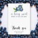 Cartão de convite para chá de fraldas em forma de grão com ilustração aquosa de mirtilos. O texto diz "um bebê doce de fruta está a caminho." Itens correspondentes disponíveis.