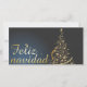 La tarjeta navideña presenta un elegante árbol de Navidad dorado formado por estrellas centelleantes sobre un fondo azul oscuro. La inscripción "Feliz Navidad" em letras curvas doradas redondea con estilo diseño festivo. 🎄 ✨