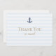 Este modelo de cartão de agradecimento náutico personalizado é perfeito para agradecer a convidados e bem-intencionados em diversas ocasiões, incluindo casamentos, nascimentos, aposentadorias e outros marcos. Ele apresenta uma âncora azul-marinho e texto em um tom dourado elegante em uma base que inclui listras horizontais azuis suaves. A âncora não é uniformemente colorida, há pontos sem cor, o que lhe dá uma aparência quente e desgastada e um sabor de artesanato que nos lembra uma impressão de xilogravura ou uma escultura em madeira. Na verdade, a imagem da âncora que inspirou este design foi originalmente feita com um carimbo simples, o que explica seu charme. No verso, incluímos algum texto placeholder no mesmo tom dourado. Você pode incluir seu(s) nome(s) no final da sua mensagem personalizada ou deixá-los de fora em favor de assiná-lo à mão. E, claro, se preferir, pode deixar o verso completamente em branco para que possa escrever sua mensagem inteiramente à mão. Em qualquer caso, por favor, certifique-se de excluir nosso texto placeholder! Você também pode alterar