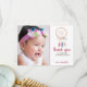 Simples e elegante, estas cartas de agradecimento personalizadas são a maneira perfeita de enviar seus obrigados incríveis a amigos e familiares por frequentar a festa de aniversário de sua filha. A design apresenta um modelo fotográfico para substituir por uma foto da aniversariante e uma pega-pia-d'água pintada manualmente com flores e penas. O texto rosa e marrom personalizável pode ser alterado para ajustado qualquer necessidade de celebração. A parte de trás apresenta uma textura de madeira lavada em branco. Um design de boho fofo.