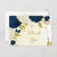 Cartão de agradecimento de casamento botânico com flores navy & brancas com folhas douradas. Os detalhes cintilantes são simulados.