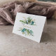 Este cartão de agradecimento às damas de honra com eucalipto dourado e verde é perfeito para um casamento simples. O design apresenta folhas e flores verdes, douradas e azuis pintadas à mão em aquarela, dispostas de forma organizada em buquês e molduras geométricas elegantes.