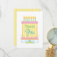 Flores cor-de-rosa e velas verdes no topo do bolo de aniversário listrado amarelo alto para ajudar sua criança de 5 anos a expressar seu apreço pela celebração.