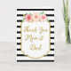 Cartão de agradecimento para os pais da noiva ou do noivo no dia do seu casamento com padrão clássico de listras pretas e brancas, detalhes dourados vintage, flores rústicas rosa e pêssego e texto em estilo de letra à mão.