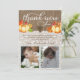 uns cartões de agradecimentos para um baptismo, um batismo, uma dedicação etc. com espaço para duas fotos. Excelente para gêmeos ou irmãos (ou apenas 2 fotos de seu bebê!). As características de design uma serapilheira e um laço olham o fundo com abóboras e caem as folhas.
