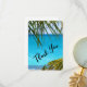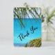 Cartões de agradecimentos de casamento com uma bela fotografia de uma praia tropical de turquesa com grandes frondes de palmeiras verdes armando a cena.