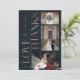 Cartões de agradecimentos de fotos de casamento, elegantes e românticas, com nossas elegantes flores de aquarela pintadas. Lindos arranjos florais arrojados, com azul-marinho rico e robusto, flores com sotaques de folhas verdes e verde-luxuosas. Apresenta três fotos para mostrar suas lindas fotos de casamento. "Love & Obrigado" é exibido em um elegante design de tipografia rosa dourada faux com nome e data bem arranjados. O verso apresenta uma foto de solteiro com elegante quadro de rosa dourado faux e sotaques florais. Espaço abaixo da foto para escrever a sua própria mensagem personalizada. Florais de aquarela pintados por moodthologia.