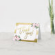Cartão de agradecimento com letras à mão escovadas, flores elegantes em aquarela rosa e folha de ouro falso. A folha de ouro falso é impressa plana.
