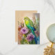 Cartão de anotação de periquito e flores roxas.