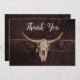 Este cartões de agradecimentos plano apresenta uma textura marrom rústica, crânio de vaca, no oeste do país, tema de casamento rodeio. Farmhouse style, antiga antiga antiguidade selvagem ocidental. design de animais legal, modernos, modernos e de fazenda. Imagem copyright Marg Seregelyi Fotografia.