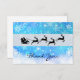 Um cartão de RSVP de Natal festivo. Uma silhueta preta de papais noeis cavalgando em seu trenó sendo puxada por sua rena voando pelo céu. O fundo é um design de floco de neve azul gelado.