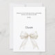 Um cartão de agradecimento de Batismo moderno e elegante. Um fundo branco, decorado com um grande laço cor de marfim com pérolas. Na frente, o texto: Obrigado, nome e data.