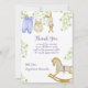 Chá de fraldas Flat Obrigado A Placa apresenta belas ilustrações aquáticas de roupas bonitas de bebê penduradas em uma linha para secar, um belo coelho recheado, um adorável cavalo de balanço no fundo da carta, e todos esses itens estão cercados por galhos delicados com folhas verdes claras.