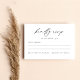 Simplifique o processo de RSVP com a nossa placa de gabinete de script mínimo moderno RSVP de casamento. Projetado em preto clássico e branco com um roteiro elegante, este cartão oferece uma maneira limpa e sofisticada de responder aos convidados. Misturando perfeitamente o estilo moderno e a simplicidade do eterno, é um toque essencial para uma suíte de casamento perfeitamente coordenada.
