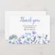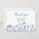 Cartão de agradecimento plano para chá de noiva com flores azuis. Design elegante de flor silvestre em aquarela. Fácil de mudar o texto.