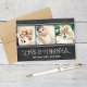 O modelo de cartões de agradecimentos de casamento "Obrigado de amor e ", estilo de quadro comum, apresenta três fotos*, assim como texto personalizado e uma mensagem que pode ser personalizada. Aspecto branco manuscrito no giz em uma imagem de fundo do estilo preto no quadro negro texturizada. *Dica da foto: recorte suas 3 fotos em forma quadrada antes de carregá-las no site. Dessa forma, eles preencherão perfeitamente o espaço quando você "mudar" as fotos padrão para carregar suas próprias fotos.