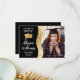 Formandos, digam "Obrigado" em estilo clássico com este obrigado de fotos "Formando" preto e dourado que você design. O modelo apresenta uma visão ondulada do lado esquerdo com a palavra "Formando" no fundo ondulado dourado acompanhada por um boné de formatura dourado no ano de classe esquerda e formando, nome e a palavra "obrigado você" em branco. A parte traseira apresenta a sua mensagem exclusiva, juntamente com a sua assinatura de fechamento e digitada. Ou, se preferir vazio, certifique-se de que esses campos sejam apagados/excluídos. Ilustração original e design por Designs Holiday Hearts (direitos reservados) com o crédito de foto marcador para Logan Isbell via Unsplash.