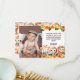 A festa de primeiro aniversario "Wild one", neutra em termos de gênero, "Obrigado", com um lindo leão, girafa e macaco rodeados por folhas verdes e flores tropicais laranja e amarela. Personalize com a foto do seu filho e sua própria mensagem especial.