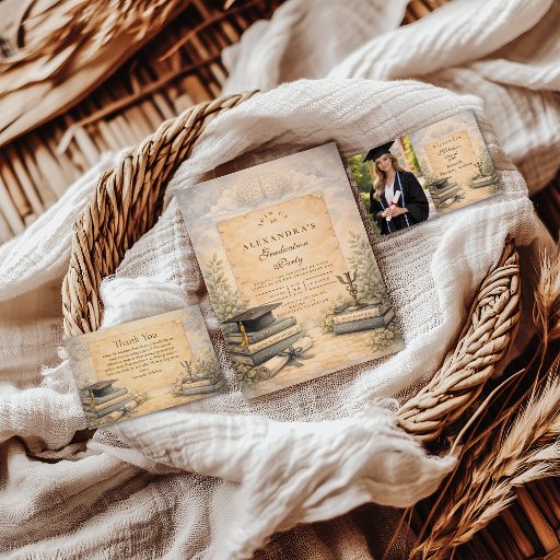 Celebrate a major academic milestone with this elegant psychology graduation design, inspired by classical scholarship and refined academic symbolism. Featuring stacked psychology and neuroscience books, a graduation cap, botanical details, and soft parchment textures, the artwork reflects dedication, intellect, and years of study.