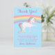 Diga obrigado com este bonito cartão unicórnio arco-íris. O unicórnio do arco-íris pastel está num fundo azul-céu. É uma carta adorável elogiar um aniversário ou chá de fraldas unicórnio.