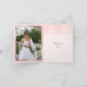 Renda branca elegante com pérolas cartão de nota de foto de agradecimento de casamento rosa apresenta renda branca com pérolas bege/ecru em rosa suave que cobre dois cantos de um retângulo branco com borda rosa. Sua foto está à esquerda dentro. Texto em marrom. Observe que a renda é "impressa" e não é tecido real. Este elegante, sofisticado e romântico design shabby chic é parte de um conjunto de casamento e é perfeito para um casamento chic de primavera, verão ou outono.