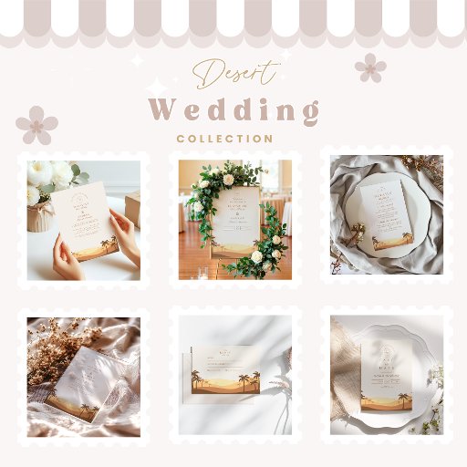 Capturar o romance quente de um pôr do sol do deserto tropical com esta design de casamento minimalista inspirada por retrô. Apresentando dunas suavemente em camadas e palmeiras silenciadas em siena queimada e tons de pêssego, esse estilo evoca um sonho paraíso do deserto perfeito para o destino ou casamentos inspirados em vassoura. O gradiente nostálgico e o layout moderno combinam o encanto do deserto costeiro com elegância do eterno.