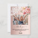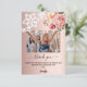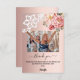 Um fundo degradê rosa dourado, decorado com flores cor-de-rosa e renda branca. Grande letra manuscrita com floreios e o texto: Obrigado. Personalize e adicione sua foto, um breve agradecimento e nome.